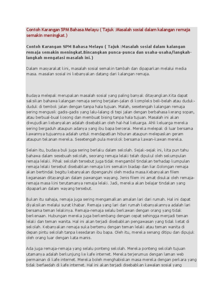 Yang terakhir yaitu smart phone menghilangkan budaya yang ada dalam masyarakat. Karangan bertajuk peranan ibu bapa dalam memupuk semangat membaca dalam kalangan remaja. Kebanyakan kes jenayah, seperti merompak, meragut, memeras ugut, merogol, mengedar dadah dan juga membunuh. Lebih separuh abad kita menghela nafas kemerdekaan, namun remaja yang merupakan bakal tunjang negara masih terbelenggu oleh pelbagai kemelut sosial. Dan yang terakhir konsumsilah makanan sehat serta bergizi agar tubuh menjadi sehat dan kuat.