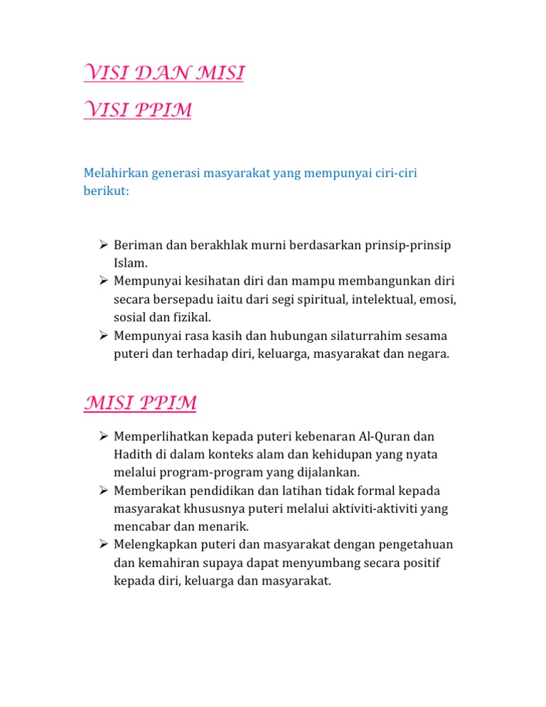 Visi Ppim from imgv2-2-f.scribdassets.com Terwujudnya bangsa dan negara republik indonesia yang adil, makmur, bermartabat, relijius, berdaulat, berdiri di atas kaki sendiri di bidang ekonomi, dan berkepribadian nasional yang kuat di bidang budaya serta menjamin kehidupan. Pengertian visi dan misi adalah suatu konsep perencanaan yang disertai dengan tindakan sesuai dengan perencanaan yang telah dibuat untuk mencapai tujuan yang telah ditetapkan dalam waktu tertentu. Misi perusahaan merupakan tujuan tujuan dan latar belakang sebuah organisasi tersebut dibuat. Meningkatkan ketersediaan sarana dan prasarana umum yang aman dan nyaman melalui program peningkatan sarana prasarana umum. Berfungsi sebagai alat hubungan masyarakat. Contoh visi dan misi antara lain sebagai berikut. Kali ini artikel yang dosenpintar.com bagikan. Visi menjelaskan mengapa suatu perusahaan berdiri.
