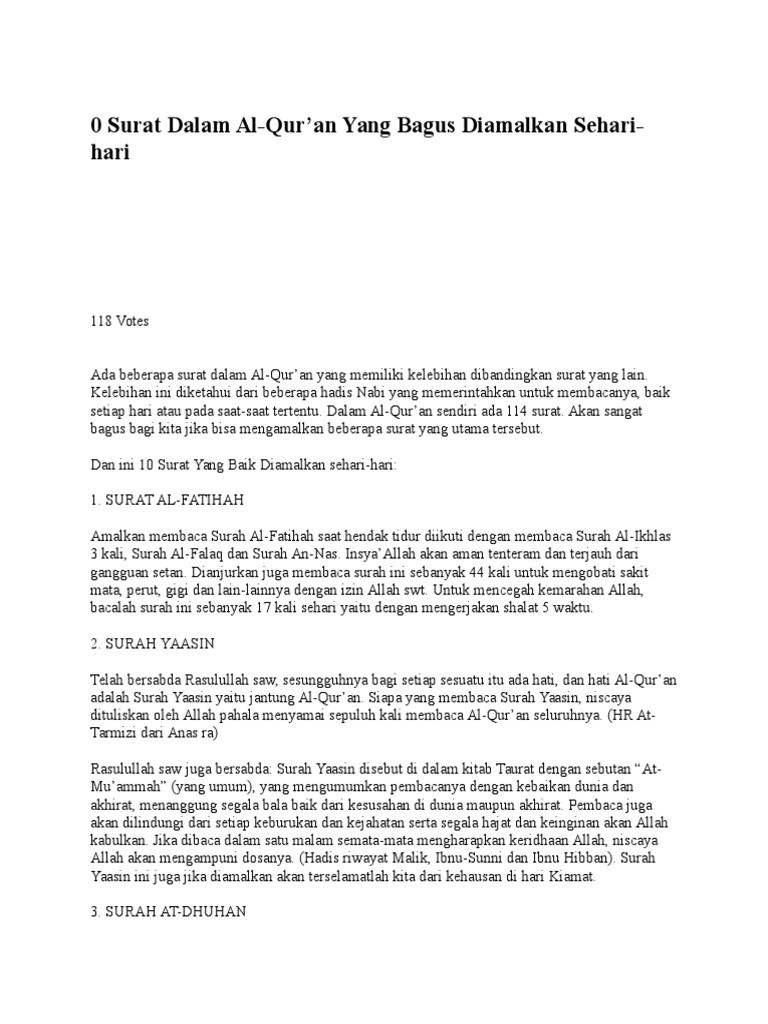 Surat Dalam Al from imgv2-2-f.scribdassets.com 4 oct 6, 2017 1. The recitation of these two surahs will protect people from many evils. Chapter 114 number of verses 6. Ia adalah doa 6 ayat ringkas, meminta kepada allah untuk perlindungan dari syaitan. Ia terdiri daripada enam ayat dan tergolong dalam surah makkiyyah (turun sebelum hijrah). It is believed that surah falaq and surah nas were revealed to the prophet muhammad (ﷺ) during a time of illness. Dari kejahatan (bisikan) syaitan yang bersembunyi , yang membisikkan (kejahatan) ke dalam dada manusia. Together these two surahs are known as al mu'awwidhatayn (meaning, 'the two protectors').